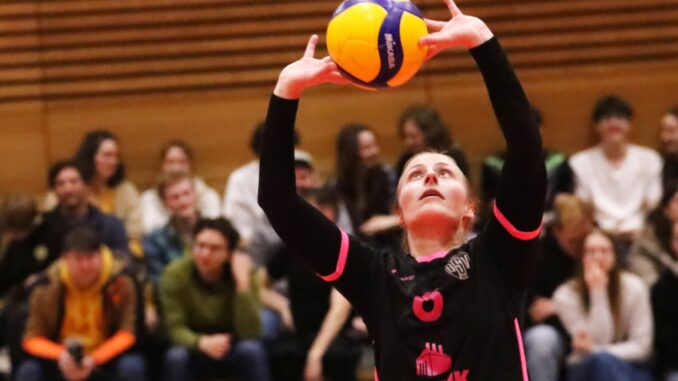 Und davon profitierten alle. Katja Löhnhardt konnte die Bälle präzise und variabel zuspielen, Porzner, Nina Baldini und Antonia Meinhardt griffen erfolgreich an, Ronja Meyer und Britta Schneider, die diesmal zunächst den Vorzug vor Alexandra Soloninkin erhalten hatte, machten die Mitte nicht nur dicht, sondern trugen auch offensiv diverse Zähler bei. Dabei hatte Meyer in Vanessa Wittmann ein körperlich klar überlegenes Gegenüber, an dem sie aber oft vorbeikam. Hinzu kamen gute Aufschläge, so dass Regensburg (ohne die im Hinspiel herausragende Sophie Bittl) nie zu seinem Spiel fand.