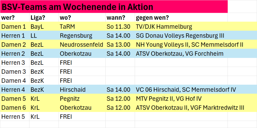 Sieben Mannschaften, zwölf Spiele – von vorweihnachtlicher Ruhe für die Mannschaften des BSV 98 Bayreuth noch keine Spur. Wer wo wann an diesem Wochenende an der Reihe ist, zeigt die Grafik.