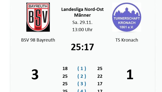 Seriös haben die Landesliga-Volleyballer des BSV 98 Bayreuth die Aufgabe gegen die TS Kronach gelöst. Nach Anlaufschwierigkeiten holten sie in eigener Halle drei Punkte (18:25, 25:22, 25:17, 25:17). Da sich die SpVgg Hainsacker wegen des Wetters nicht in der Lage gesehen hatte, nach Bayreuth anzureisen, fiel das mit Spannung erwartete Duell des Tabellenzweiten mit dem -dritten aus. Spitzenreiter SG Donau Volleys Regensburg III gab beim VC DJK Amberg II ebenfalls den ersten Satz ab, erhöhte aber sein Konto schließlich vor den Heimspielen gegen Lichtenfels und Bayreuth (am 13. Dezember) auf 19 Punkte. Dahinter folgen Hainsacker ( 15) und der BSV (14).